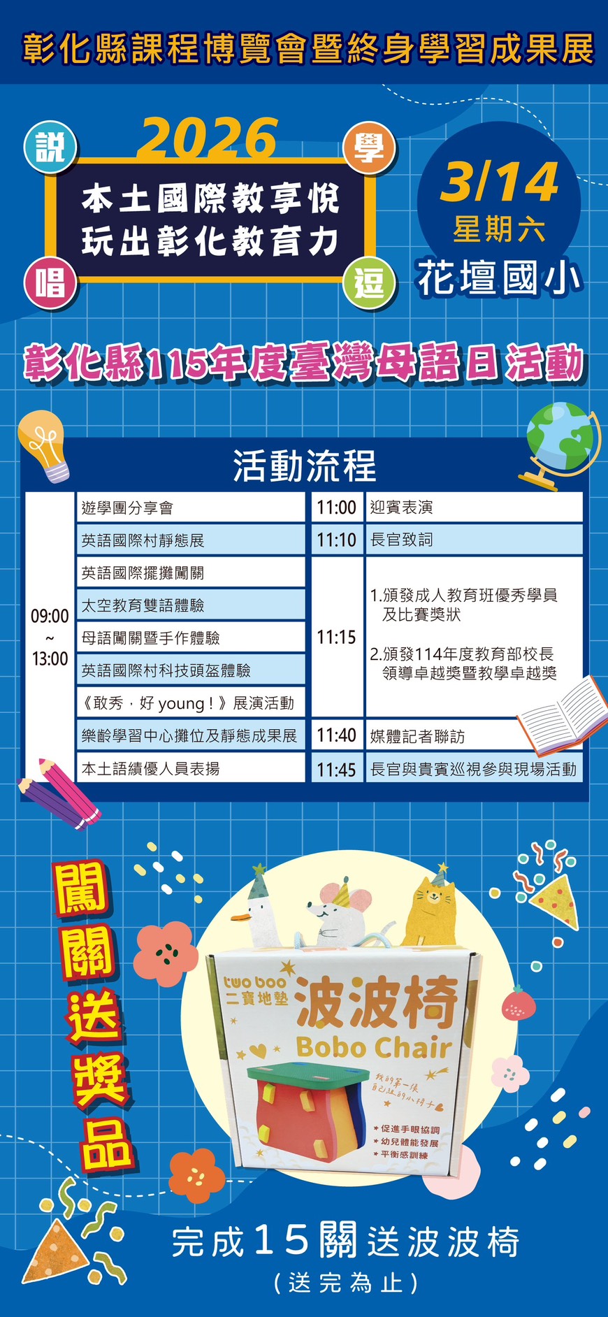 轉知「本土國際教享悅,玩出彰化教育力」課程博覽會~完成闖關送波波椅唷,歡迎親子同遊。
