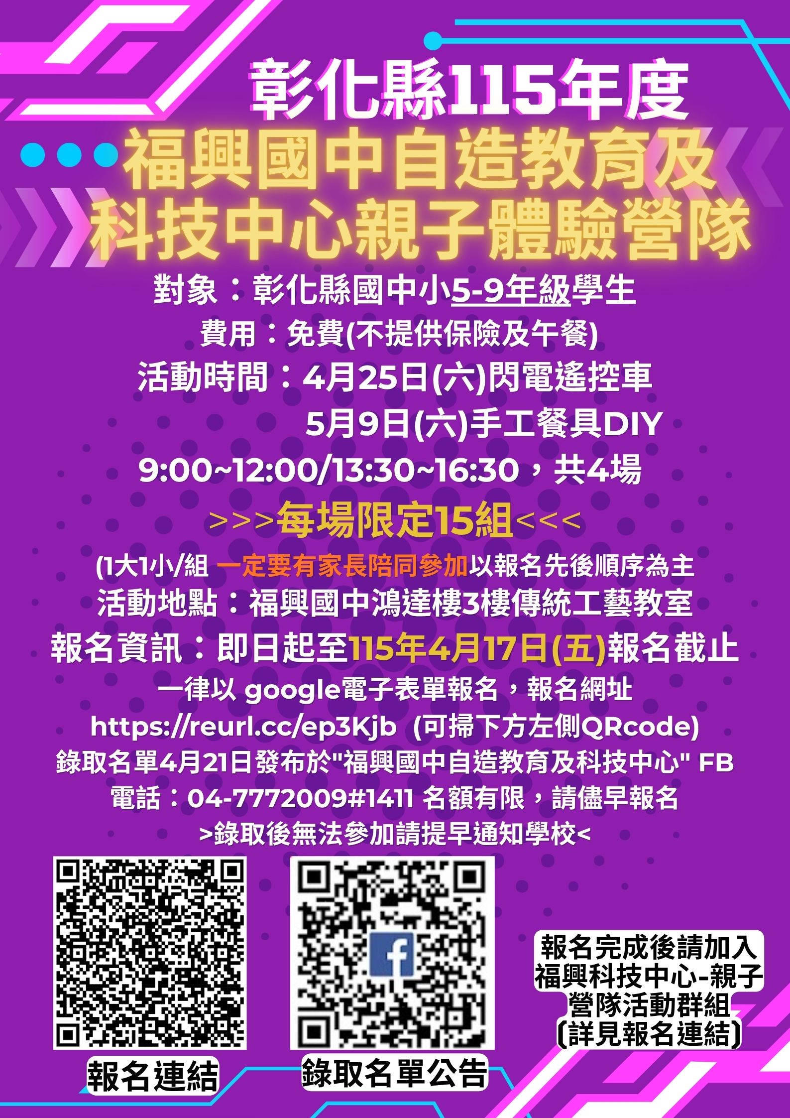 轉知:福興國中科技親子體驗營隊報名 ,機會難得,想要參加者,請速報名喔!